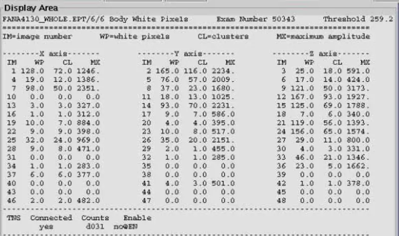 11. GP बोर्डवर X,Y आणि Z ग्रेडियंट ड्राइव्ह फायबर ऑप्टिक्स डिस्कनेक्ट करा, EPT व्हाइट पिक्सेल हेड आणि बॉडी स्कॅन करा. निकाल पास आहे. हे सूचित करते की पांढरा पिक्सेल ग्रेडियंटद्वारे प्रेरित आहे. तो पांढरा पिक्सेल केवळ एका अक्षावर उपस्थित नाही असे पाहिले. नंतर SGA PS, GP बोर्ड बदला, परंतु तरीही समस्या आहे. X,Y,Z ग्रेडियंट ड्राइव्ह फायबर ऑप्टिक्स पुन्हा कनेक्ट करा.