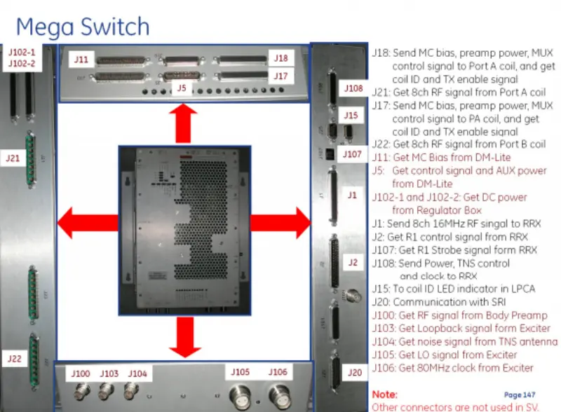 SRI कम्युनिकेशन (J20): SRI बाह्य सिग्नल इनपुट (J100, J103-J106) सह डेटा एक्सचेंज सक्षम करते: बॉडी प्रीम्प वरून RF सिग्नल, एक्सायटरकडून लूपबॅक सिग्नल, TNS अँटेना, LO सिग्नल, आणि एक्साइटरकडून 80 MHz घड्याळ प्राप्त करा